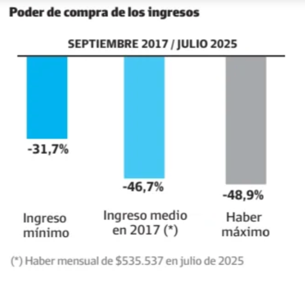Sin embargo, el universo de quienes sí pudieron jubilarse con los aportes o con moratorias también es dramático. Los haberes perdieron poder de compra desde 2017 en un 32% para quienes cobran la mínima, y un 49% para quienes se jubilaron con aportes.