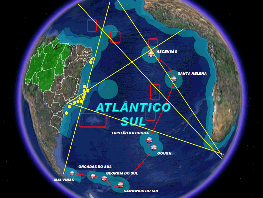 La América mirada desde el Cono Sur y su Atlántico, resalta el colonialismo británico y su anillo insular en Santa Elena, Ascensión, Malvinas, San Pedro y Esquivel, que le sirve como proyección logística hacia el continente antártico.