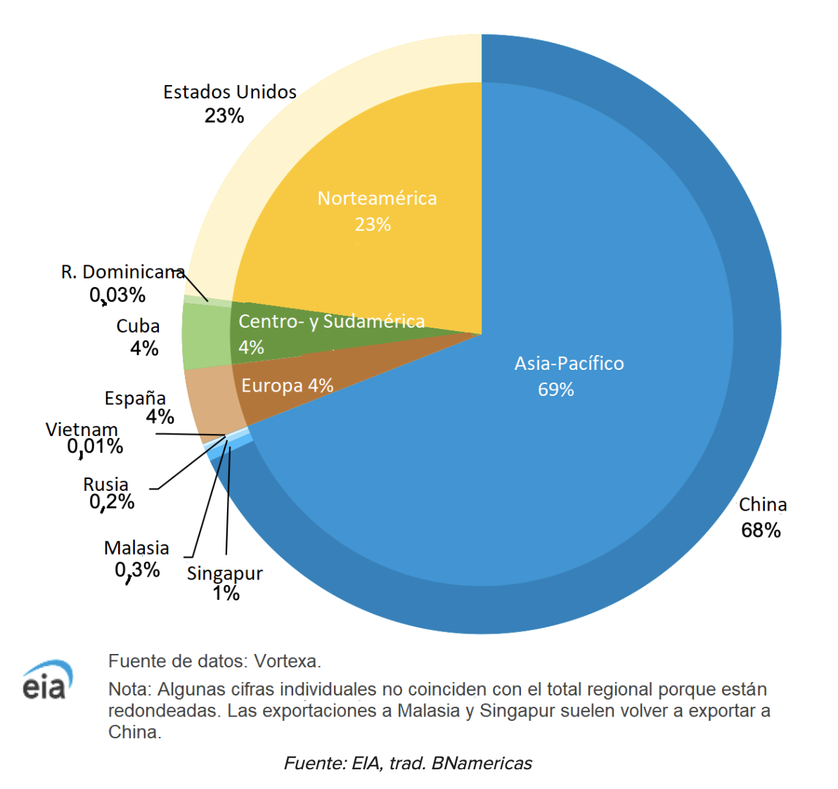 Para Venezuela también son importantes las compras chinas, en definitiva, el 70% de sus ventas de petróleo la tienen como destino. En segundo lugar, Estados Unidos, con poco más del 20% de los despachos energéticos. Estos datos son de 2023.