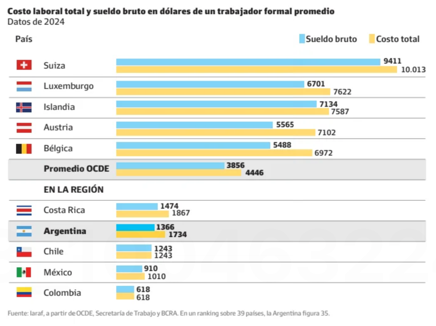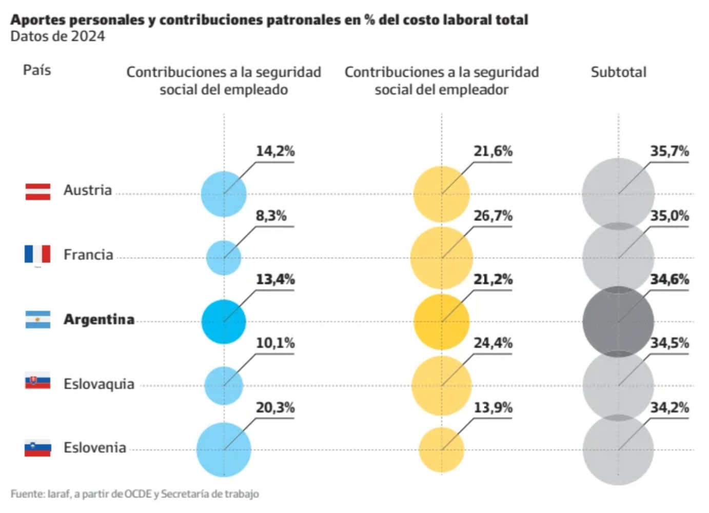 En cuanto a las denominadas prestaciones no salariales que deben afrontar trabajadores y empresas, es decir, los aportes a la seguridad social que financian el pago de las jubilaciones, Argentina se encuentra dentro del promedio de muchos países como Austria, Francia o Eslovaquia.